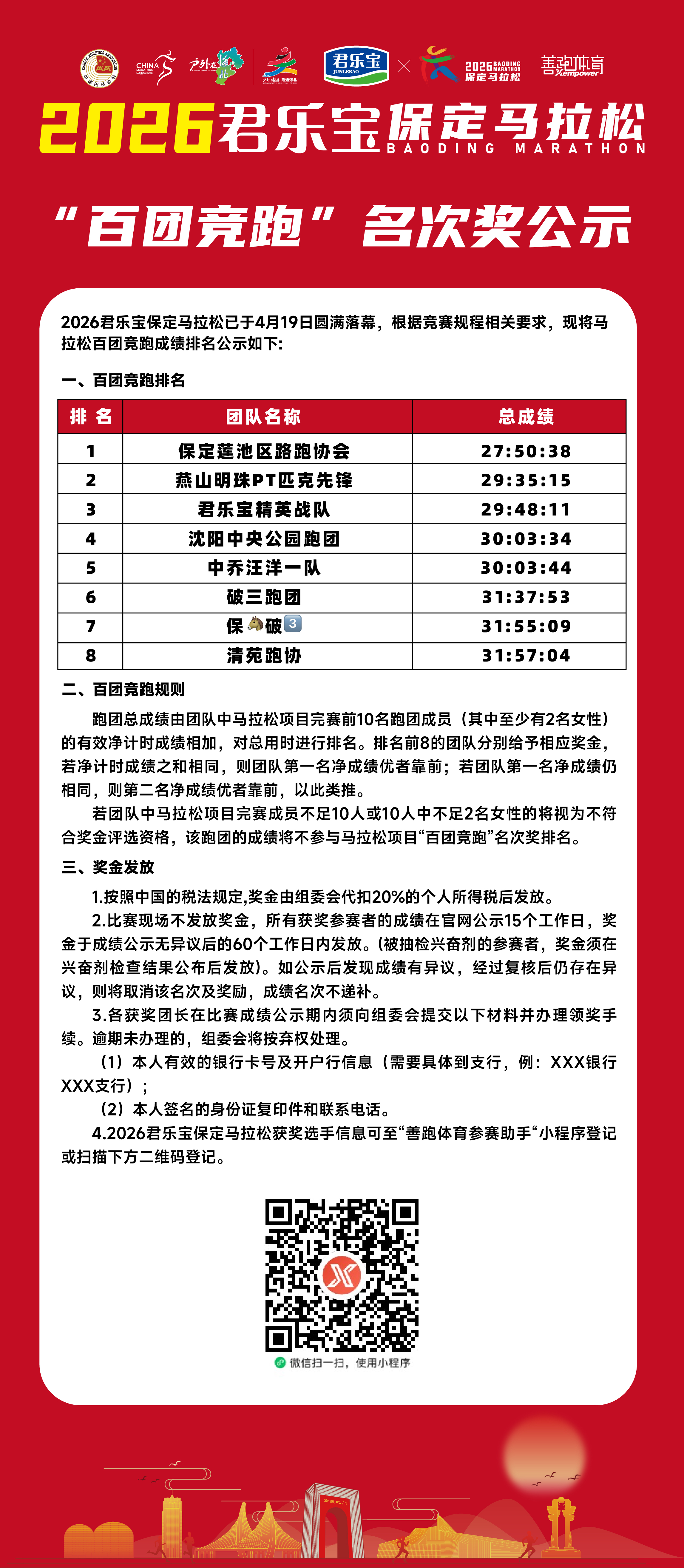 2026君乐宝保定马拉松百团竞跑名次奖公示